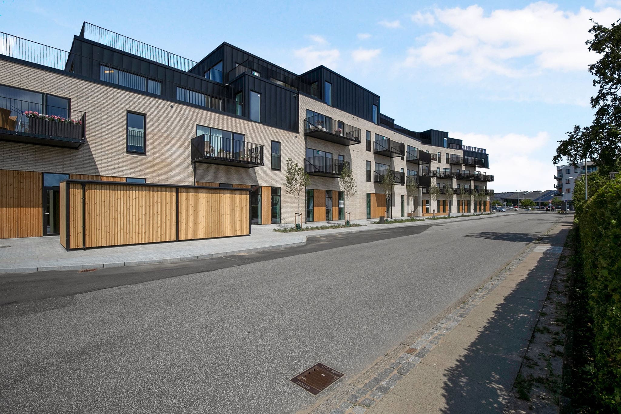 Bebyggelsen fremstår eksklusiv både i kraft af opdeling og disponering af bygningskroppene i det grønne byrum og i kraft af materialevalget.